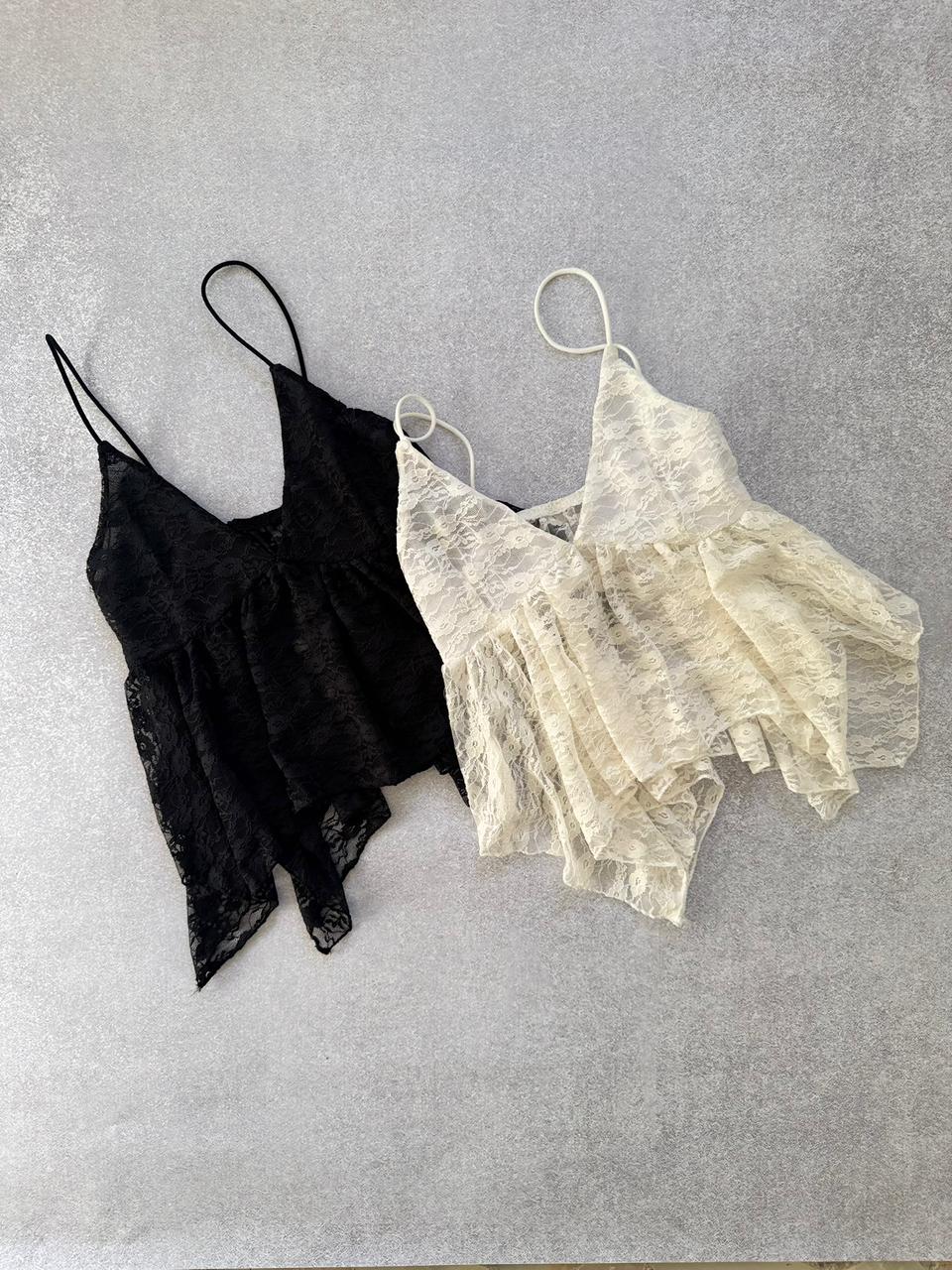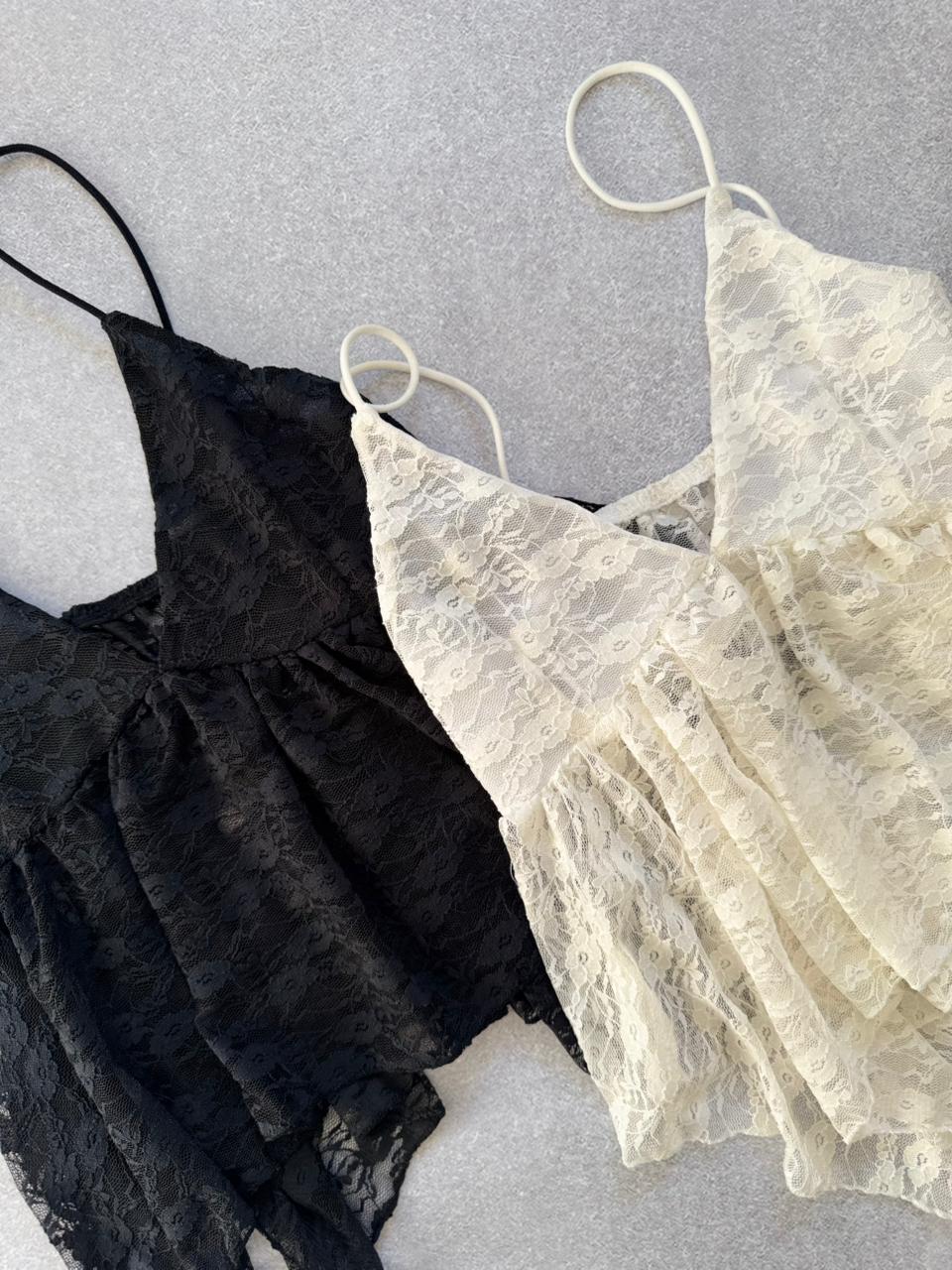 Un diseño romántico y sofisticado que se roba todas las miradas. Confeccionado en delicado encaje, este top combina frescura y sensualidad en partes iguales. Su corte fluido con breteles finos lo hace ideal para elevar cualquier look, ya sea de día o de noche.